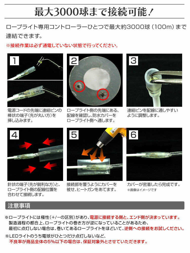 コンセントプラグ1本でLEDロープライト100mまで使用可能です。